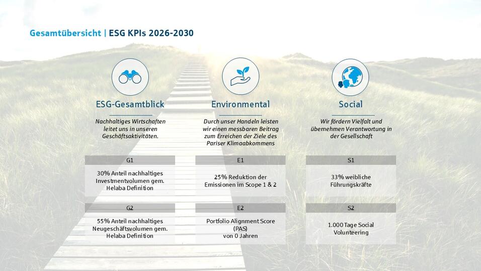 Darüber hinaus setzt die Helaba klare Ziele für gesellschaftliche Verantwortung und Vielfalt. Bis 2030 soll der Anteil von Frauen in Führungspositionen auf ein Drittel steigen. Zudem plant die Helaba Gruppe, jährlich 1.000 Tage Social Volunteering zu leisten und damit aktiv Engagement in der Gesellschaft zu fördern.
